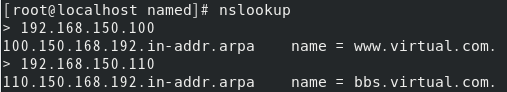 最后使用nslookup,再输入之前反向数据配置文件当中设置的ip,即可得到结果。