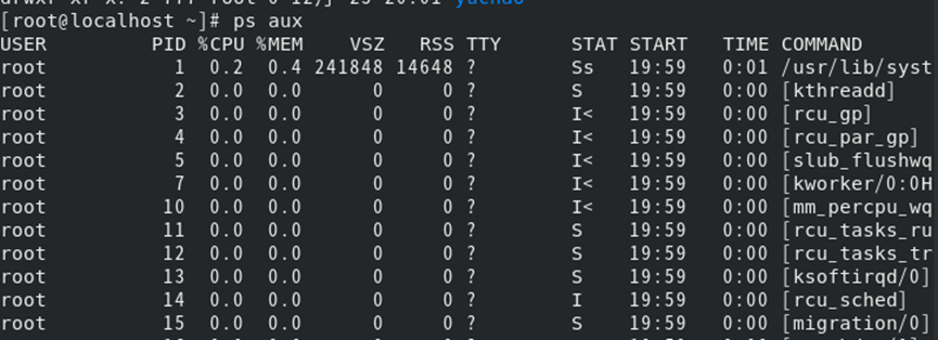 使用ps aux查看系统中所有进程的详细信息。其他a表示显示所有用户的进程;u表示以用户为中心显示进程信息,包括所有进程所有者的用户名;x表示没有控制终端的进程。
