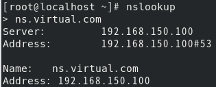 最后使用nslookup命令,再使用ns.virtual.com就可以查看到解析成功