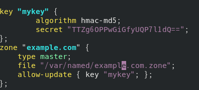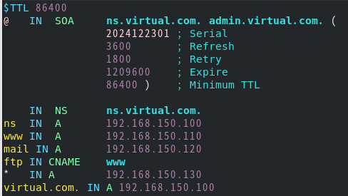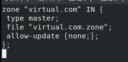 zone "virtual.com" IN { type master; file "virtual.com.zone"; allow-update {none;}; };