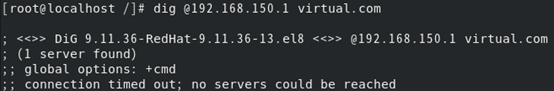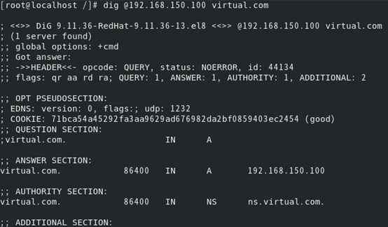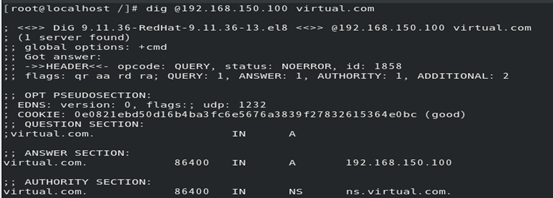 输入dig @192.168.150.100 virtual.com命令测试递归查询