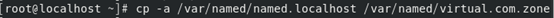 接着使用cp -a /var/named/named.localhost /var/named/virtual.com.zone命令复制一份正向解析的模板文件。