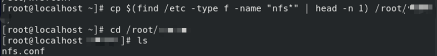 然后使用命令cp $(find /etc -type f -name “nfs” | head -n 1) /root/###将文件复制到以“自己姓名拼音”创建的文件夹当中。再跳转到该目录下,查看是否复制成功。这里还可以使用ls /root/###进行查看该目录下的文件。