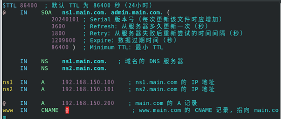 ns1 IN A 192.168.150.100 ; ns1.main.com 的 IP 地址