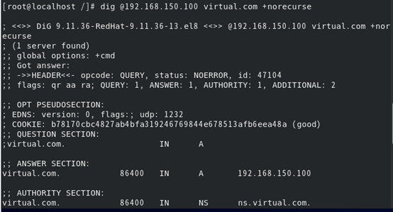 以及dig @192.168.150.100 virtual.com +norecurse命令测试迭代查询