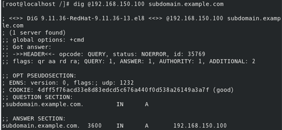 最后使用systemctl restart named重启DNS服务器,再执行dig @192.168.150.100 subdomain.example.com返回的值。