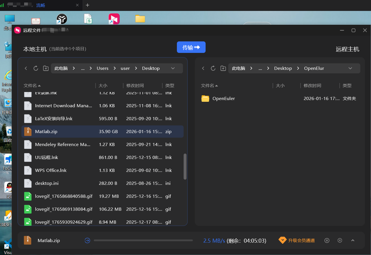- ToDesk:传输大文件效率表现优异,传输 35.9GB 的 Matlab 压缩包时,速度在 4.75MB/s,预估完整传输耗时约 2 小时 9 分钟。