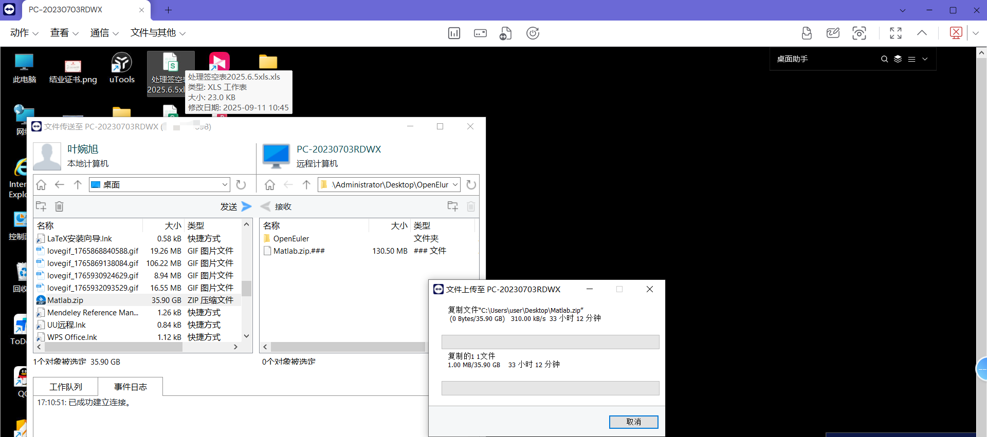 - 大文件传输效率:单向传输一个 35.9GB 的 matlab 压缩包,从控制端传输至受控端。