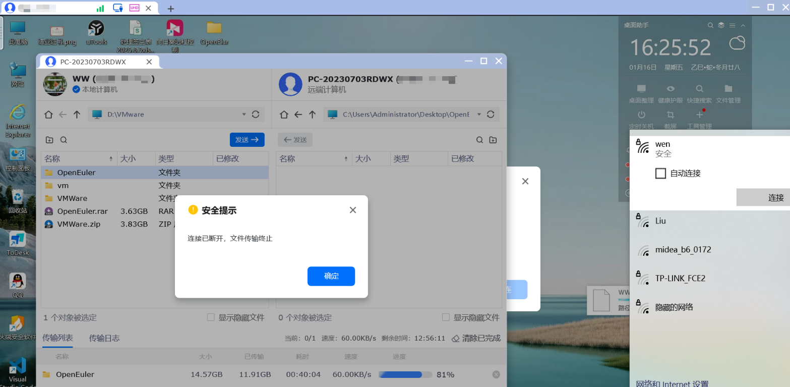 - ToDesk:当传输进度达 80% 时主动断网,工具弹出 “连接已断开,文件传输终止” 提示;恢复网络后,无需手动触发即可自动从断点续传,续传速度稳定在 5.75MB/s,进度顺利推进,最终完整传输文件且无损坏,展现了可靠的断点续传能力。