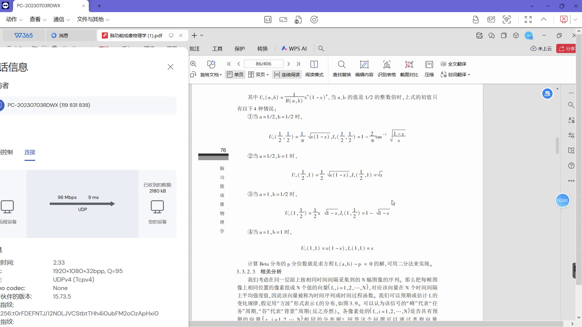 - TeamViewer:打开TeamViewer的连接信息,显示当前带宽达 96 Mbps、延迟仅 9ms,在体验中,文档内的复杂数学公式、文字段落显示清晰无错位,操作过程里画面同步流畅,未因内容信息密度高而出现卡顿、拖影。