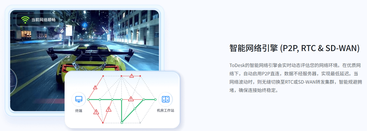智能网络引擎能实时评估网络,在优质环境下自动启用P2P直连以降低延迟,在波动时智能切换至最佳中转路径以保证连接稳定。