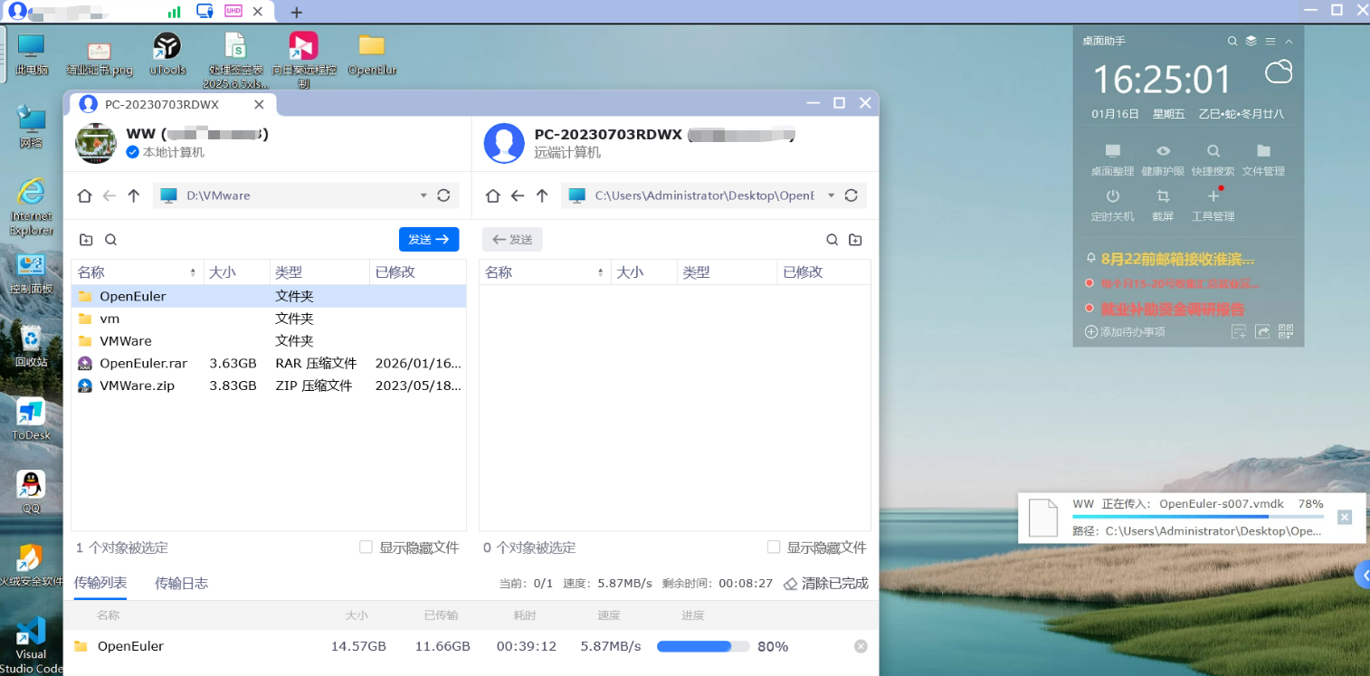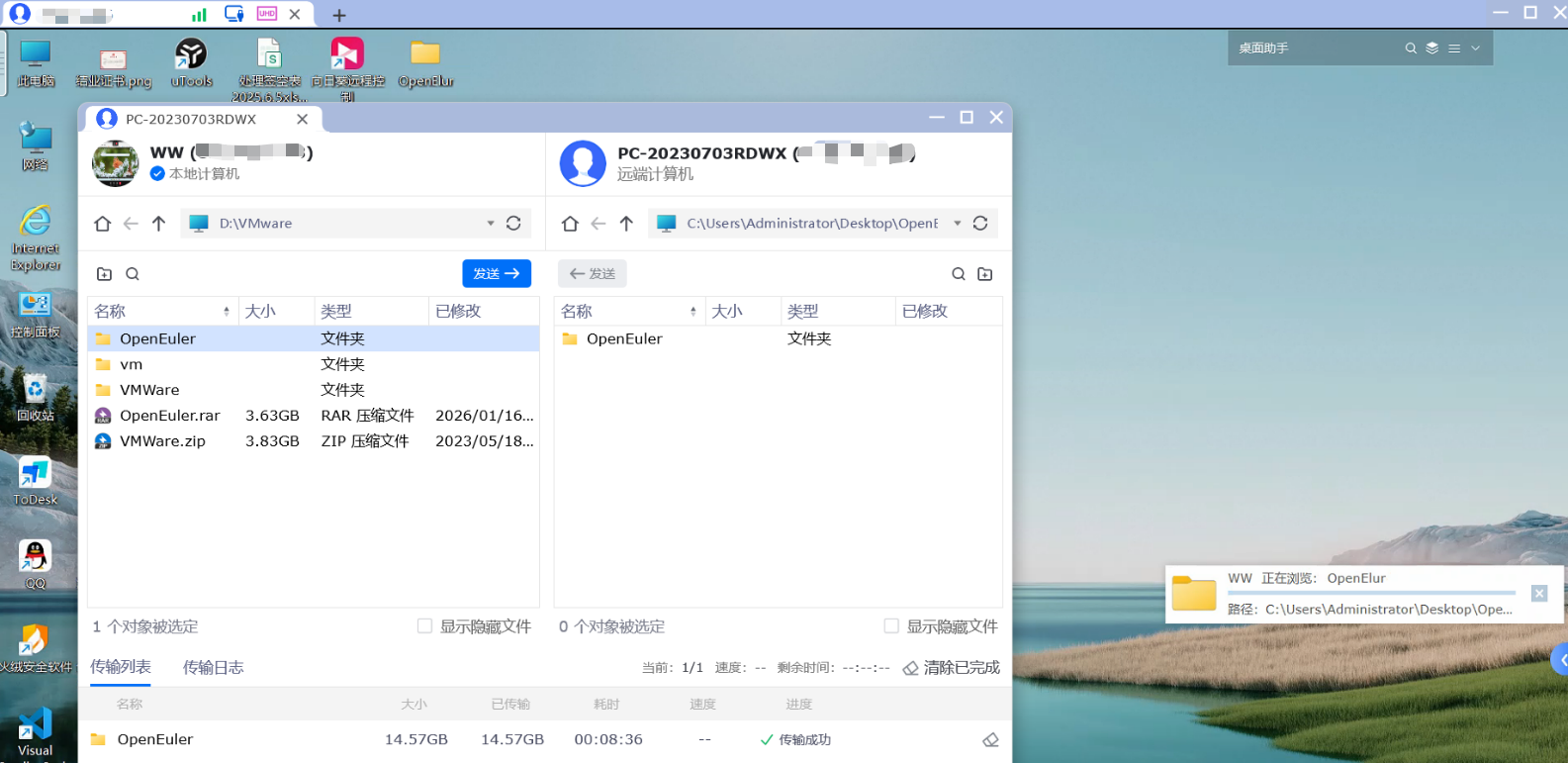 - 向日葵:国内节点下传输速度表现一般,传输 OpenEuler 零散文件文件夹时,速度约 1.9MB/s,14.57GB 多文件传输耗时约 2 小时 10 分钟;小文件并发处理能力有限,部分零散文件存在传输延迟,仅适合轻量、低频的小文件批量传输需求。