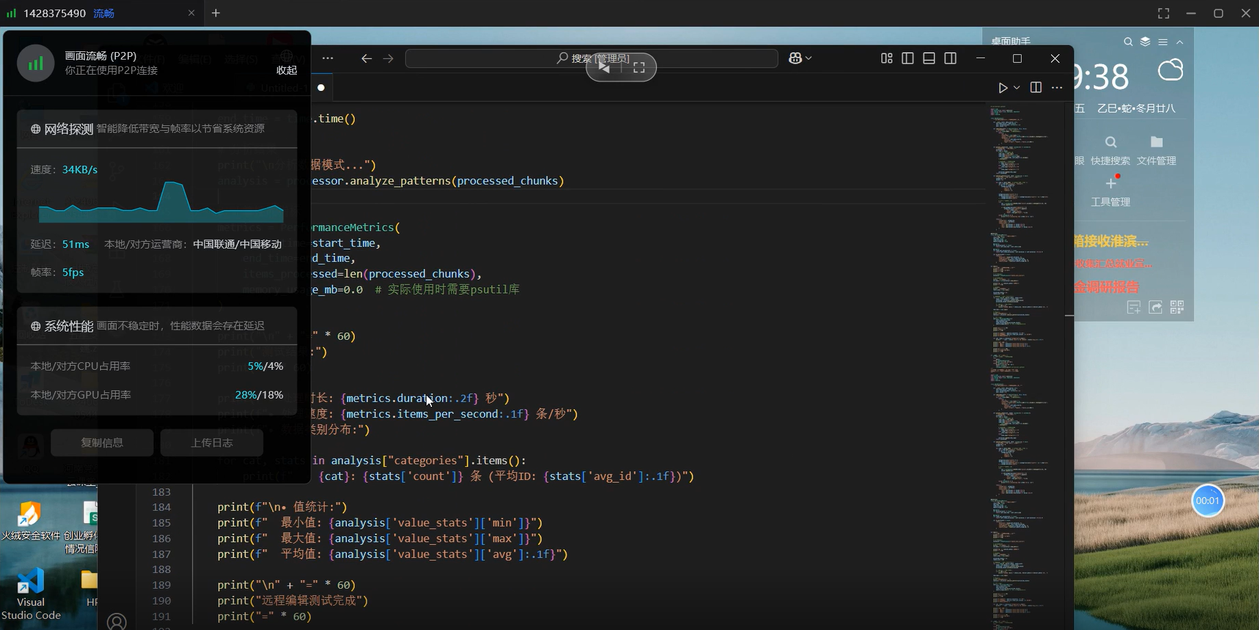 - UU远程:在 VS Code 进行 Python 代码编辑时,受限于 4fps 的低帧率与 3.1% 的丢包率,整体流畅度一般,尽管延迟仅 16ms,但键入字符、滚动代码时仍存在卡顿与延迟,仅适合低频代码查看与简单编辑的轻量场景。