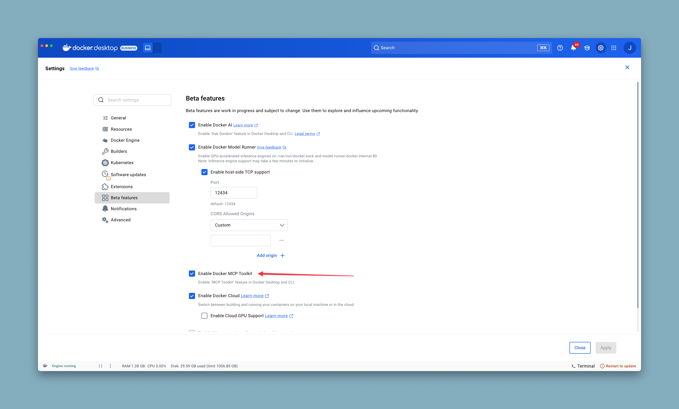 Docker Desktop中启用MCP Toolkit的配置界面