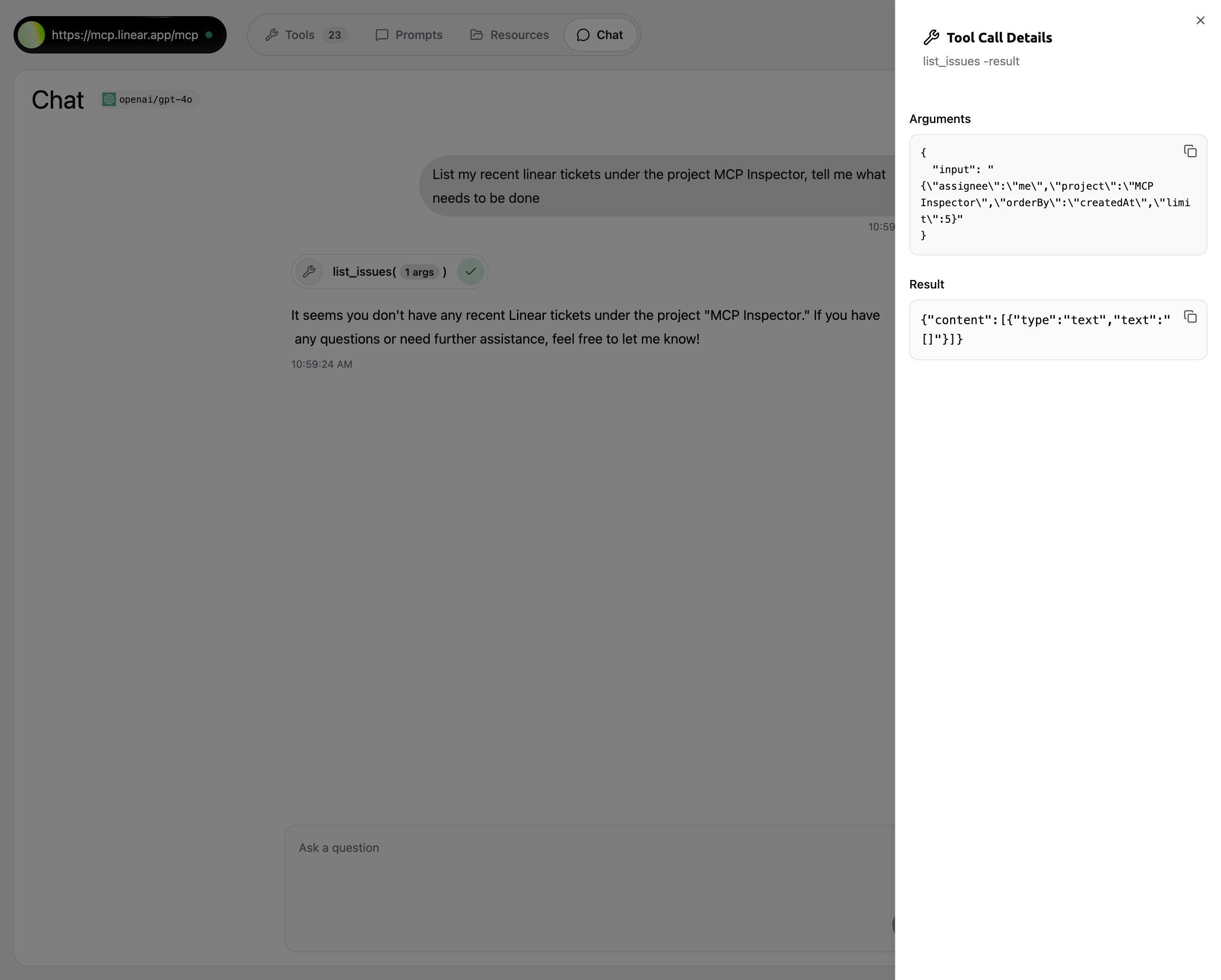 MCP服务器聊天交互过程,展示用户提问到工具调用的完整流程