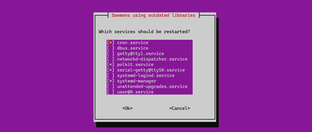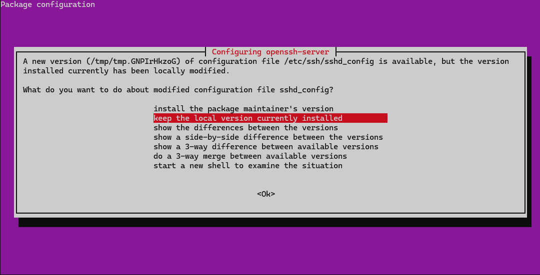 apt upgrade -y,该操作会更新很多内容,其中可能包括:- sshd服务,显示这个界面时建议保持当前版本的配置,也可以按 ↑ 键选择安装新版sshd,选中之后回车即可: