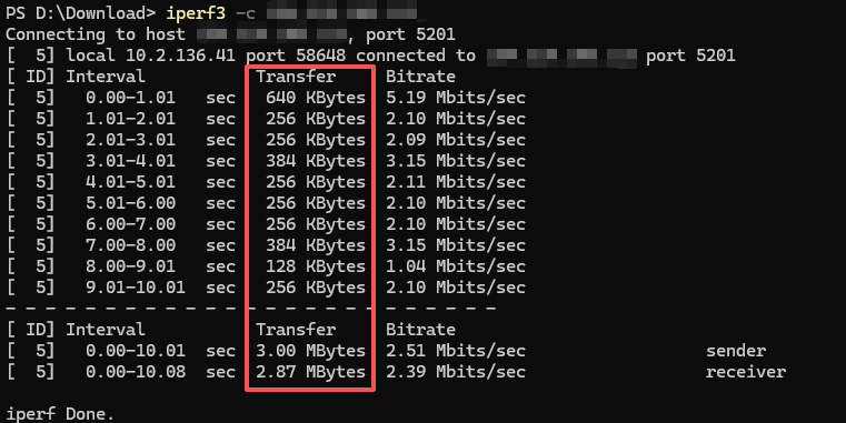 .iperf3.exe -c 192.168.1.10,即可测试网络带宽,结果参考(差距很大):
