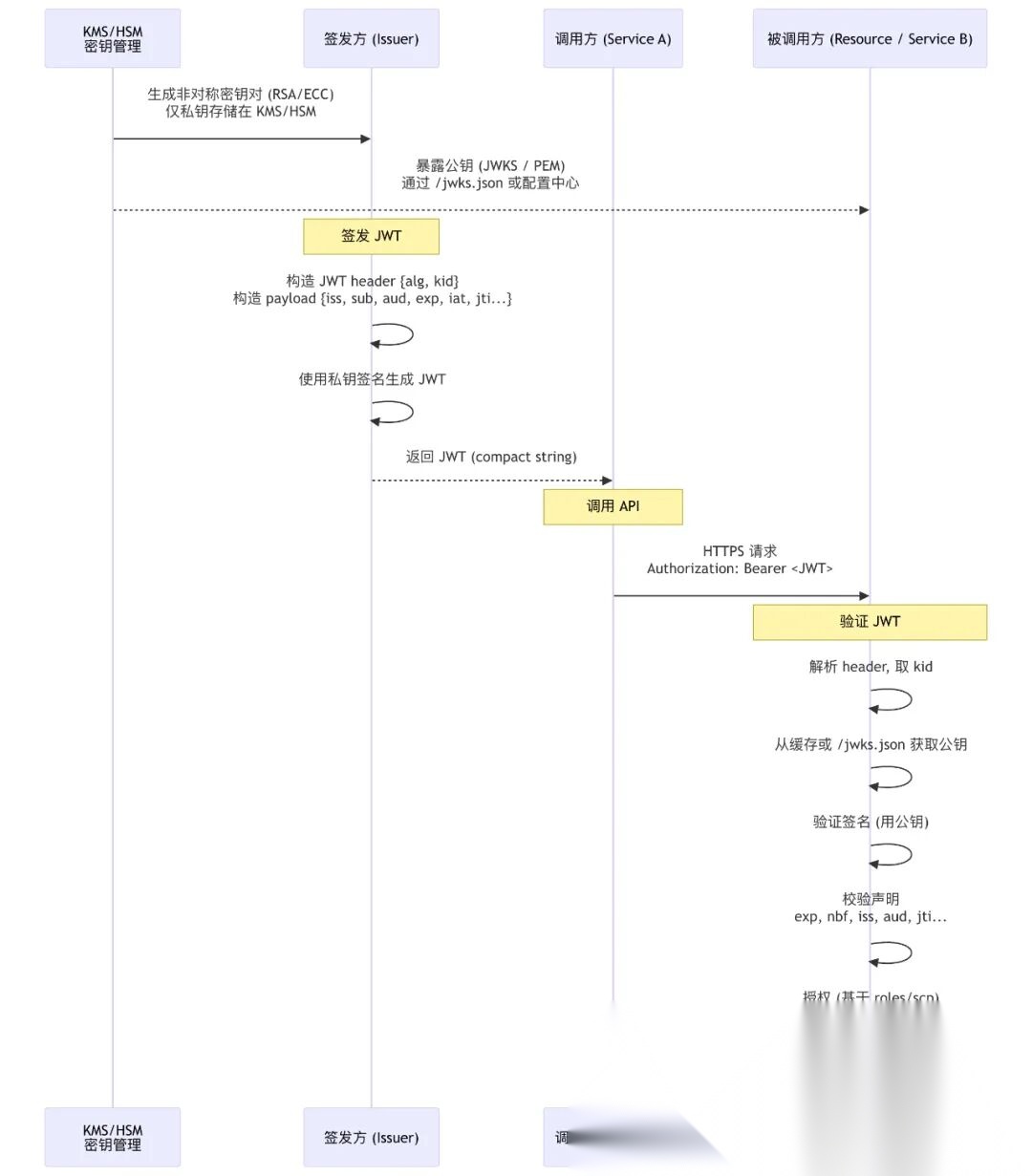 - • 用 服务 A(Issuer) 用自己的 私钥 签发 JWT(含 issuer/aud/exp/iat/jti 等),通过 HTTPS 调用时把 JWT 放在 Authorization: Bearer头;