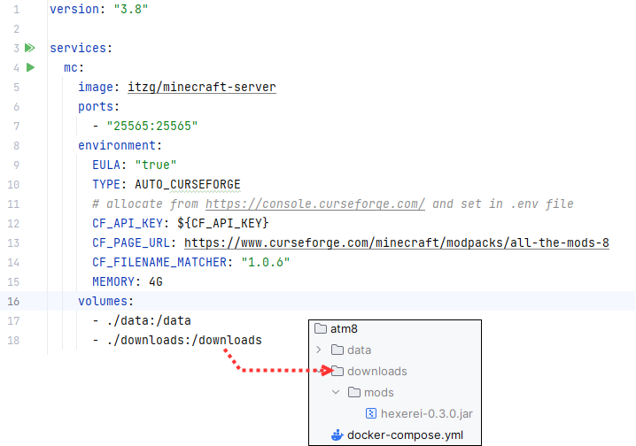在项目根目录创建my-modded-server.yml,配置模组服务器: