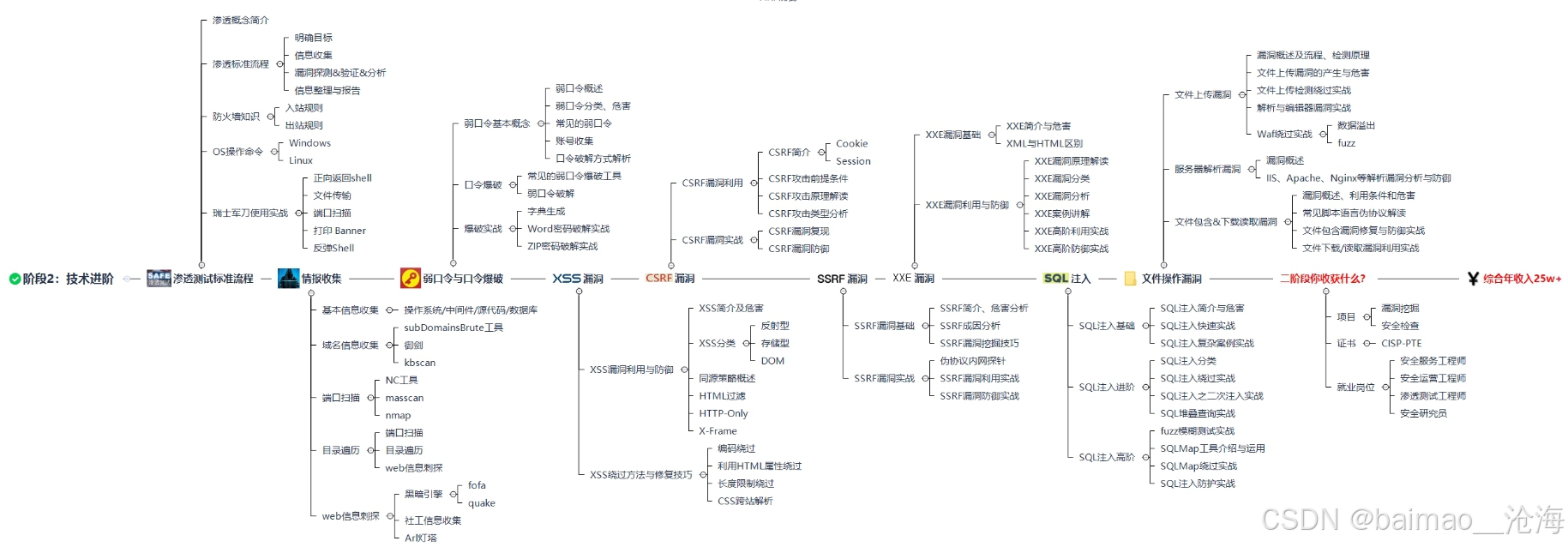 内容概要:包括 内网、操作系统、协议、渗透测试、安服、漏洞、注入、XSS、CSRF、SSRF、文件上传、文件下载、文件包含、XXE、逻辑漏洞、工具、SQLmap、NMAP、BP、MSF…
