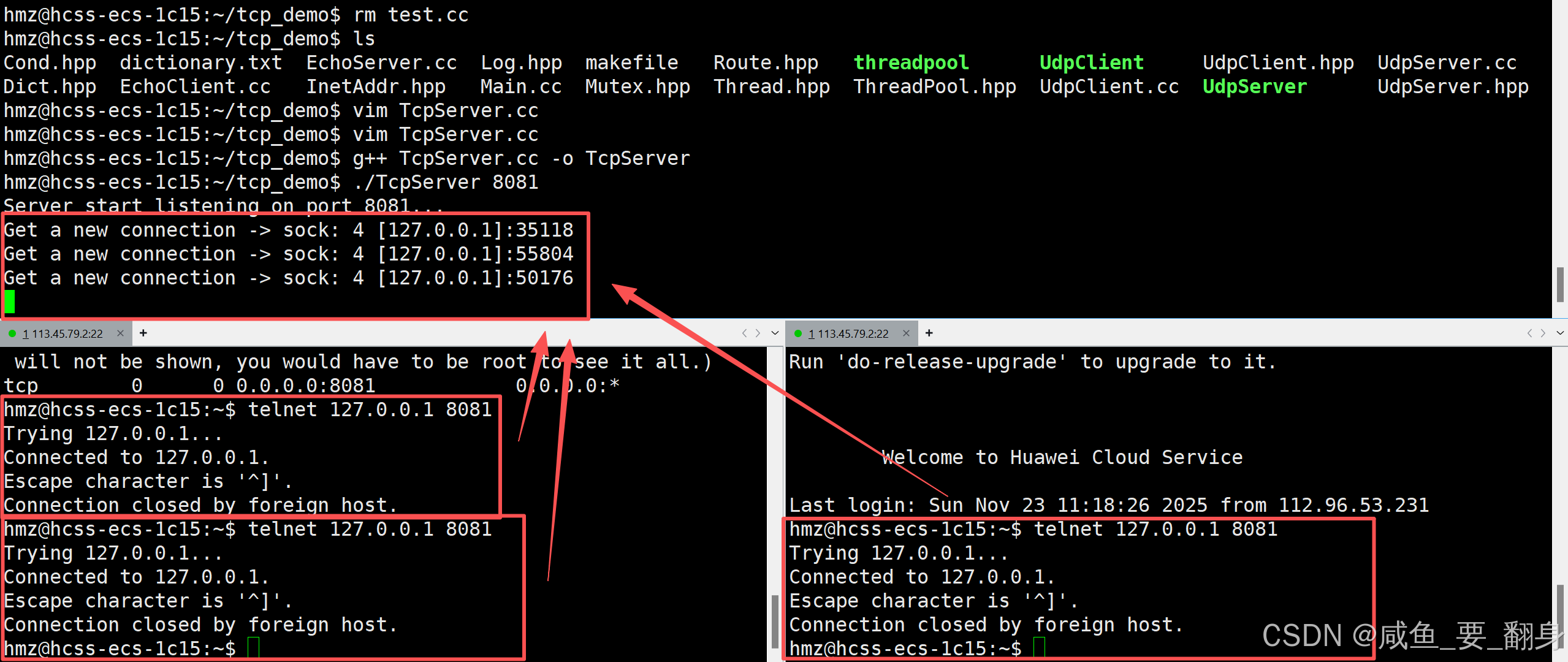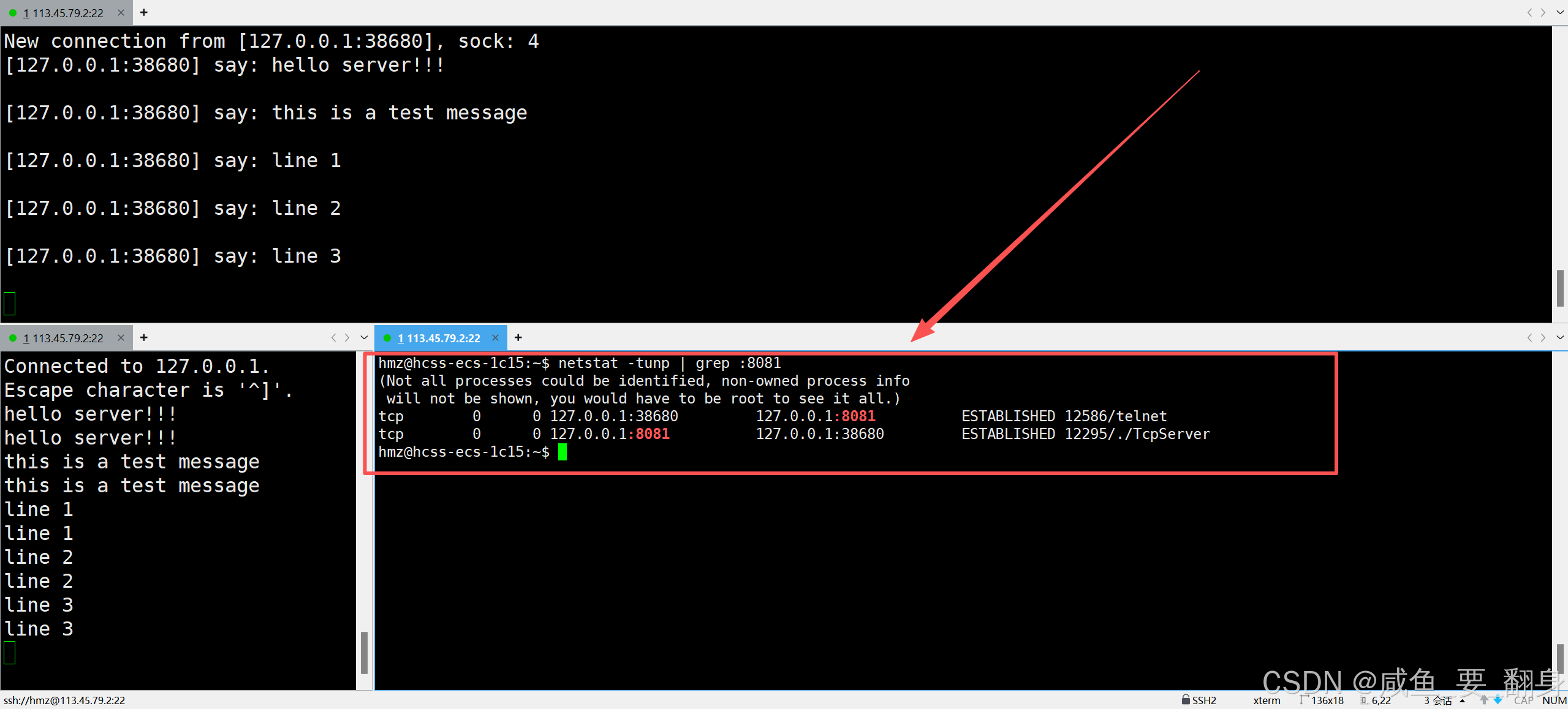 在telnet中输入:hello server!!! 你应该看到:hello server!!!
