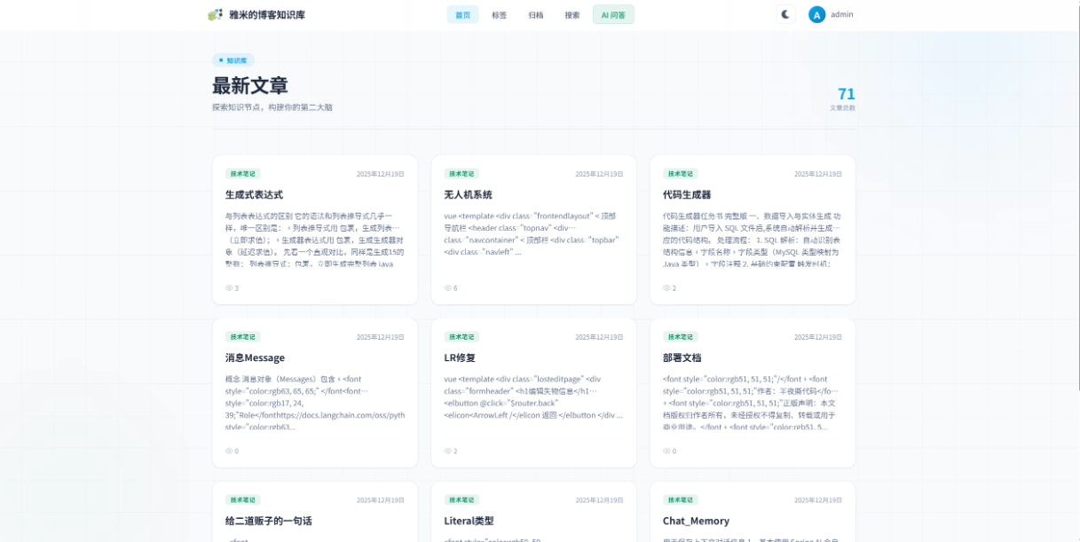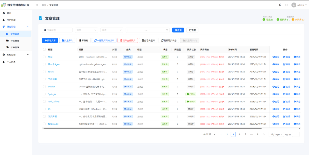 系统实现了多源知识智能向量化处理,支持将博客文章、技术文档、研究论文等各类文本内容通过先进的嵌入模型(如OpenAI Embeddings、本地化BGE模型等)转换为高维向量,并存储到Milvus向量数据库中。这一过程不仅仅是简单的文本存储,而是实现了语义层面的深度理解和组织,使知识检索从传统的关键词匹配升级为语义相似度匹配。