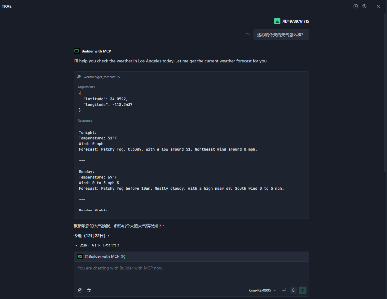 @mcp.tool():装饰器,用于标记这是一个MCP工具,类似Java中使用@Bean或@Controller标记Spring组件async def get_alerts(...):异步函数,处理HTTP请求,避免阻塞主线程,类似Java中使用CompletableFuture或@Asyncdata = await make_nws_request(url):等待异步请求完成,类似Java中使用CompletableFuture.get()if not data or "features" not in data:检查数据是否存在,类似Java中检查null和Map.containsKey()[format_alert(feature) for feature in data["features"]]:列表推导式,类似Java的Stream API的map操作periods[:5]:切片操作,获取前5个元素,类似Java的List.subList(0, 5)" --- ".join(alerts):将列表元素用分隔符连接成字符串,类似Java的String.join