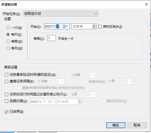 这里我选择每天都执行,选择一个系统比较空闲的时间,半夜三更最适合干这种事。