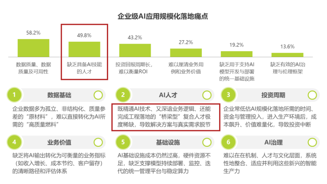 行业快速发展的背后,人才缺口成为核心痛点。报告明确提及:企业级AI应用规模化落地的最大阻碍之一,就是专业人才短缺。但这里的“缺人”,并非缺只会写基础代码的执行者,而是既懂AI技术原理、又熟悉业务逻辑,还能完成工程化落地的“桥梁型”复合型人才。