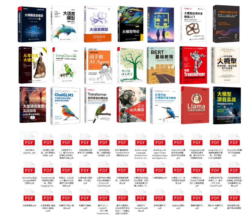 学习AI大模型离不开书籍文档,我精选了一系列大模型技术的书籍和学习文档(电子版),它们由领域内的顶尖专家撰写,内容全面、深入、详尽,为你学习大模型提供坚实的理论基础。