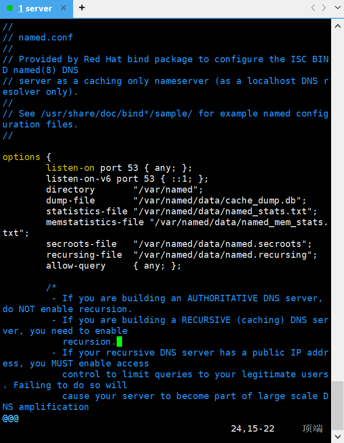 listen-on port 53 { any; }; #重要,监听地址及端口号,监听任意ipv4及端口