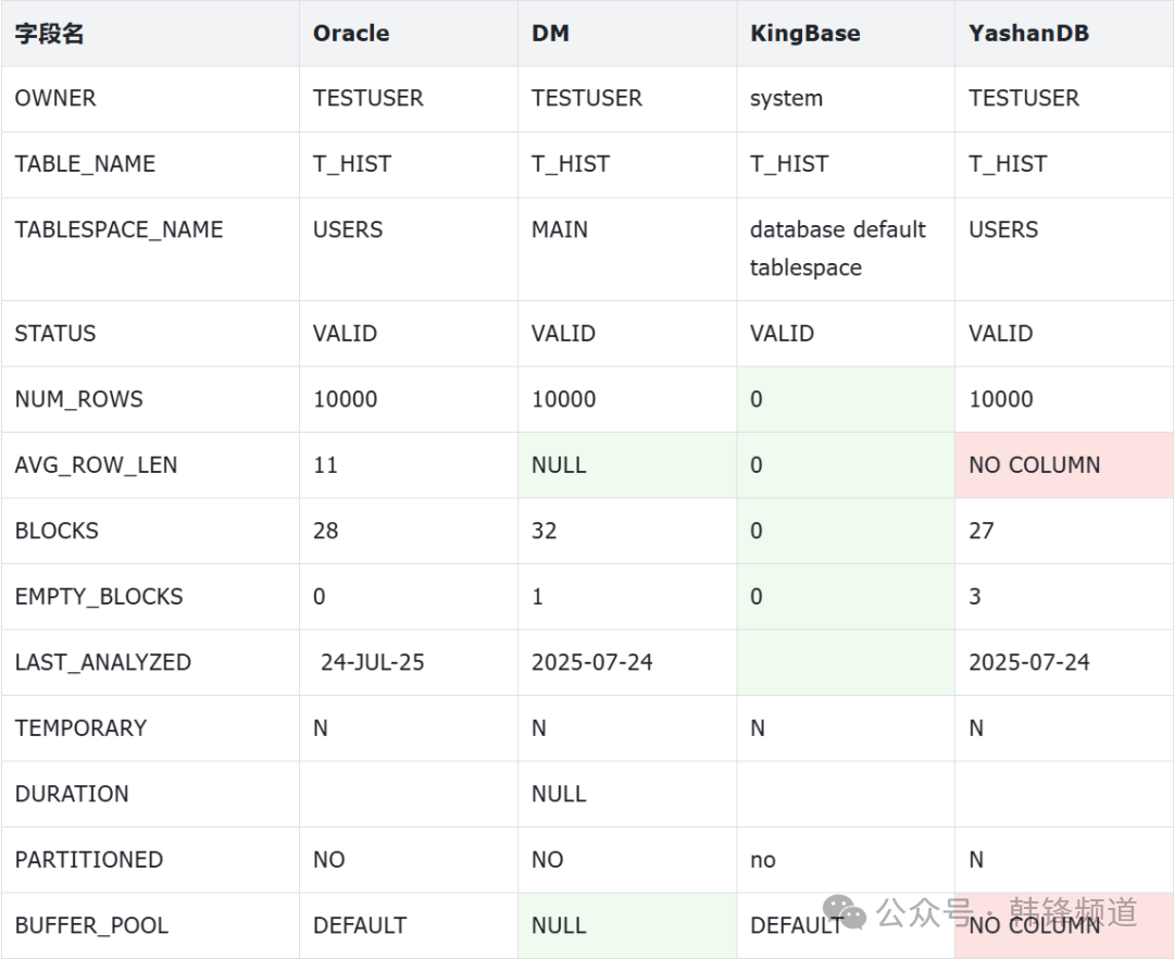 这是针对对象-表查看信息最为常见的数据字典,也是开发人员比较关注的。下面选择了比较常见的一些字段。因不同数据库实现机理有差别,有些字段未做实现(用红色底框),有些字段支持但数值为空(用绿色底框)。