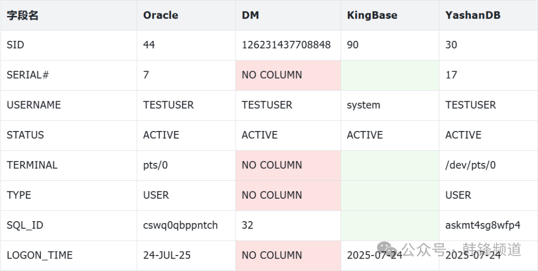 这是针对会话管理常见的动态视图,是运维DBA作为熟悉的。下面选择了比较常见的一些字段。因不同数据库实现机理有差别,有些字段未做实现(用红色底框),有些字段支持但数值为空(用绿色底框)。