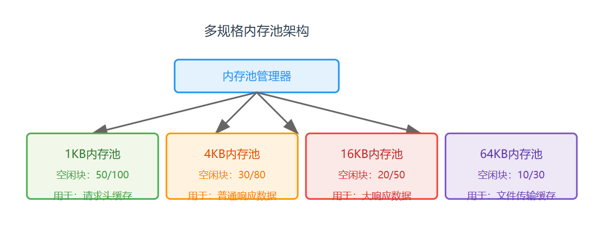 单一固定大小的内存池无法适配所有场景(如同时需要1KB和16KB内存)。解决方案是实现「多规格内存池」:为每种常见块大小(1KB、4KB、16KB、64KB)创建独立内存池,分配时根据需求选择对应池。