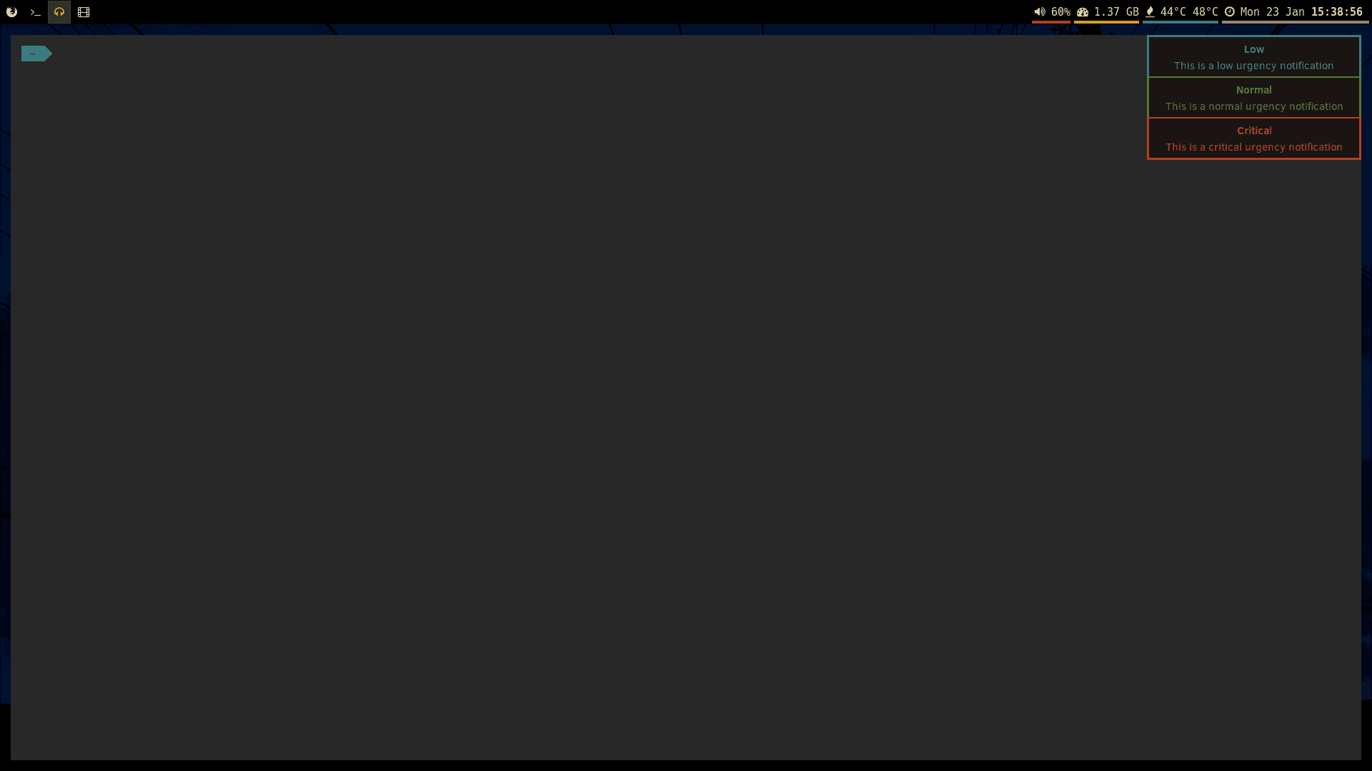 Dunst支持三种通知优先级:低、正常、关键。通过颜色编码,用户可以直观地区分通知的重要性: