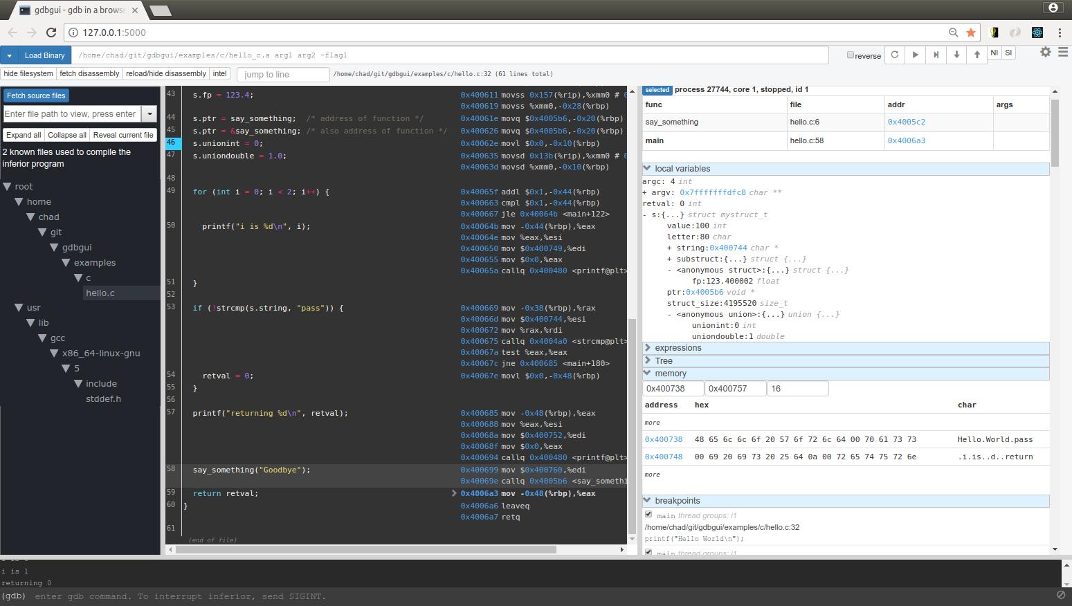 也可以在启动gdbgui时直接指定要调试的程序: