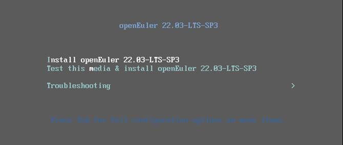 - 如图2-12所示,光标选择第一项Install Open Euler 22.03-LTS-SP3,直接按Enter键进行系统安装。