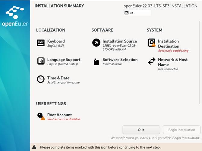 - Open Euler Linux Installation Summary安装总览界面,如图2-15所示: