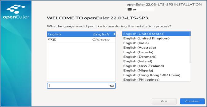 - Open Euler Linux欢迎界面,选择安装过程中界面显示的语言,初学者可以选择“简体中文”或者默认English,如图2-14所示: