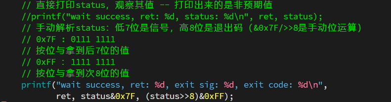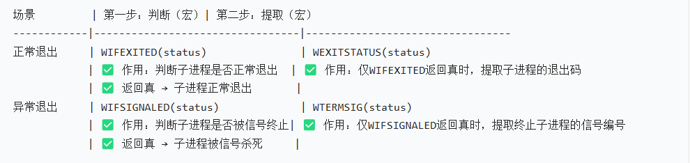 2、状态检测:获取子进程的退出状态(如正常结束、被信号终止等)