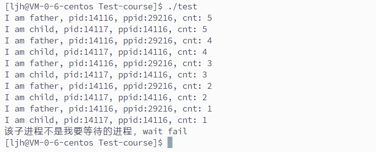 父进程创建子进程后,故意传入错误的子进程 PID 调用waitpid,因实际退出的子进程 PID 与目标 PID 不符,导致等待失败,触发 “该子进程不是我要等待的进程,wait fail” 提示,证明waitpid仅能正确获取指定 PID 子进程的状态