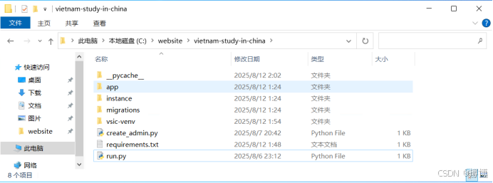 其中,app:项目代码文件夹;instance:sqlite数据库存放目录;vsic-venv:项目虚拟环境目录;run.py项目执行文件。