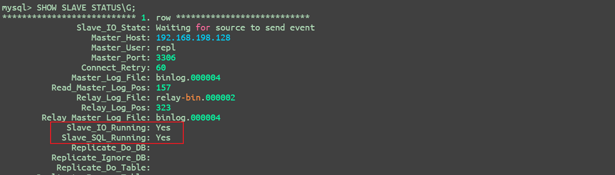 relay log默认是不开启的,当在 MySQL 实例上执行CHANGE MASTER TO配置主库信息,并执行START SLAVE/REPLICA启动复制线程(IO 线程和 SQL 线程)后,从库会自动创建中继日志文件。可以通过以下命令查看状态: