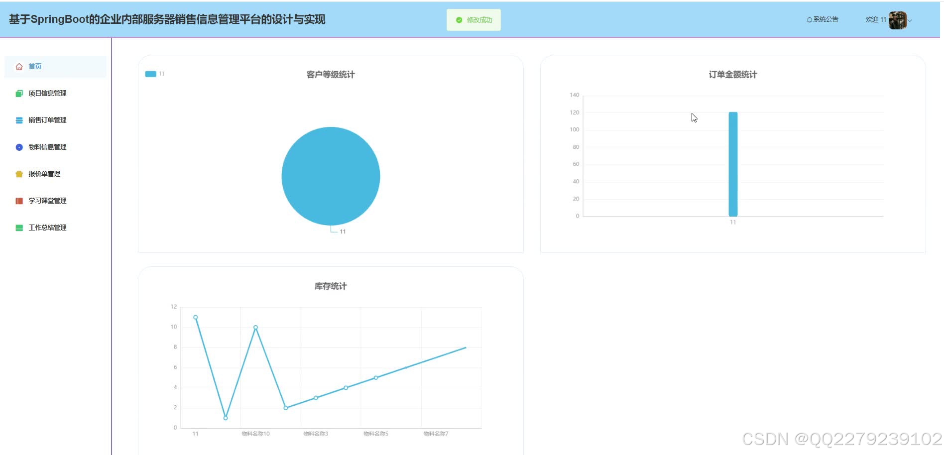针对企业内部服务器销售信息分散、订单跟踪困难、数据统计低效等问题,设计并实现基于 Java Spring Boot 的企业内部服务器销售信息管理平台系统。系统采用 Spring Boot 构建后端服务,结合 MyBatis-Plus 实现数据库高效操作,前端通过 Vue.js 与 Ant Design Vue 搭建交互界面,搭配 MySQL 数据库确保销售数据安全存储。