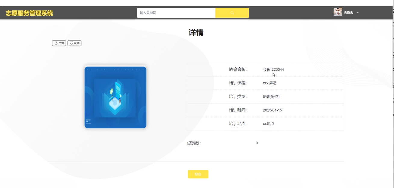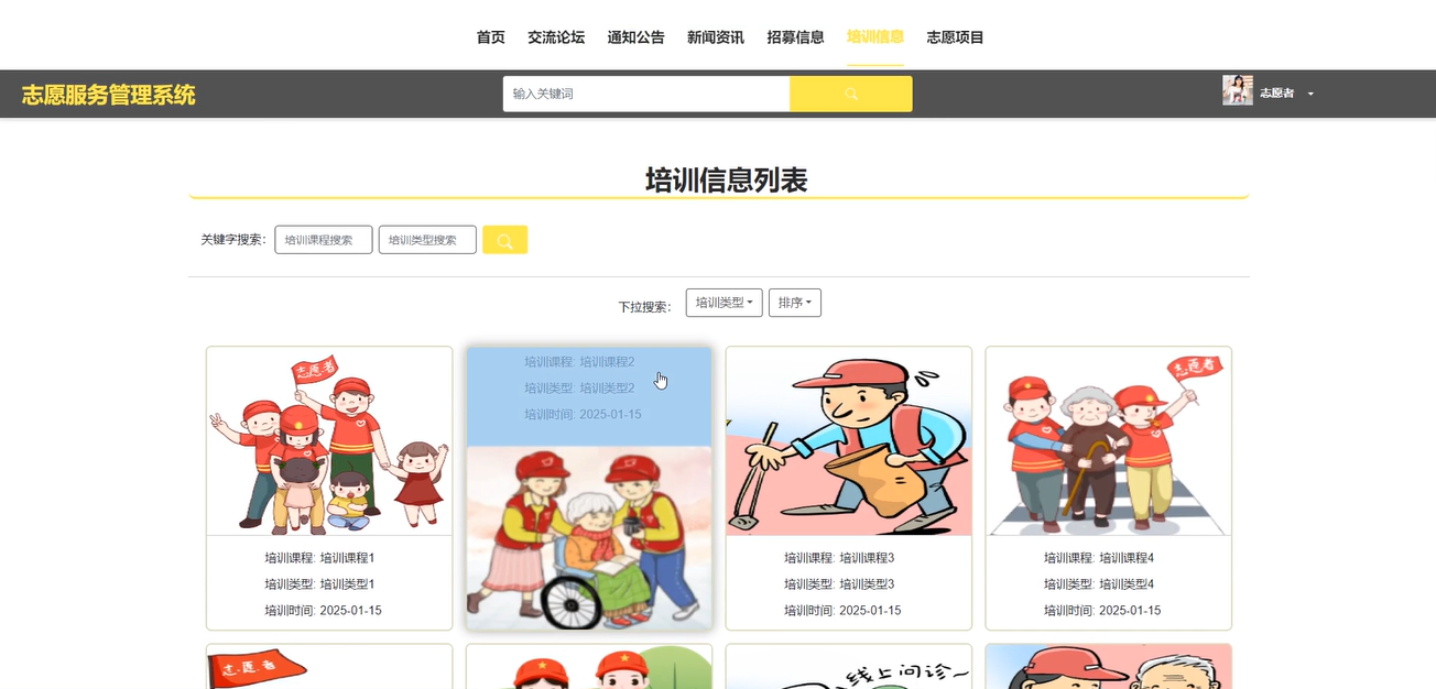 查看培训课程列表,志愿者可以根据培训课程、时间、类型等条件进行搜索,并选择下拉培训类型进行排序。他们还可以对培训课程进行点赞、收藏和评论,并报名参加。界面如下图所示。