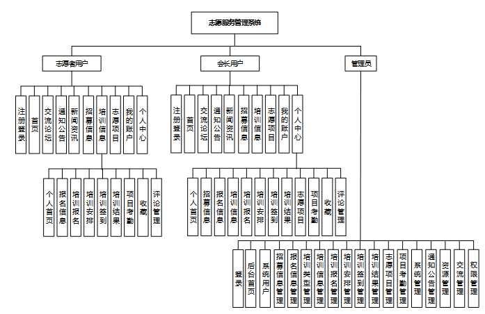 (3)功能布局:包括志愿者用户的注册登录、首页信息浏览、论坛互动、报名与培训管理;会长用户的审核与管理功能;以及管理员的全面系统管理。各模块紧密协作,确保系统的高效运行和用户体验。