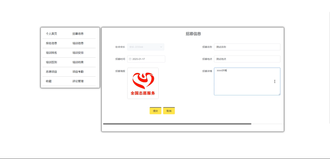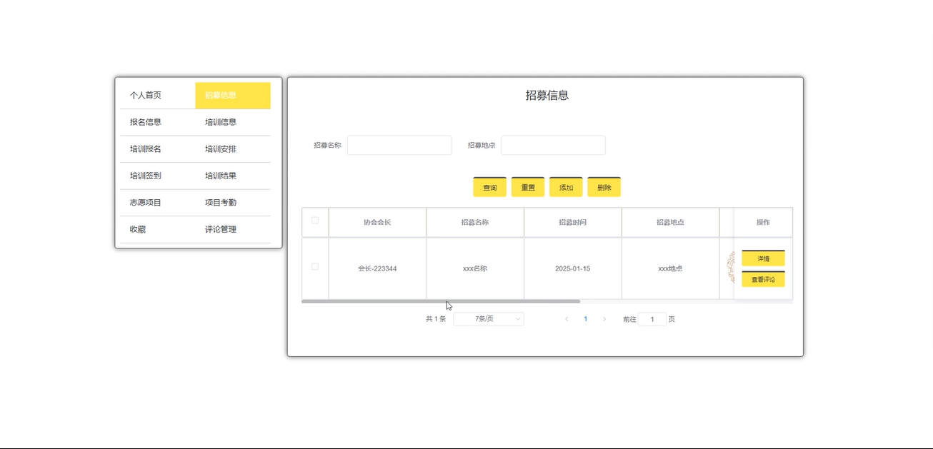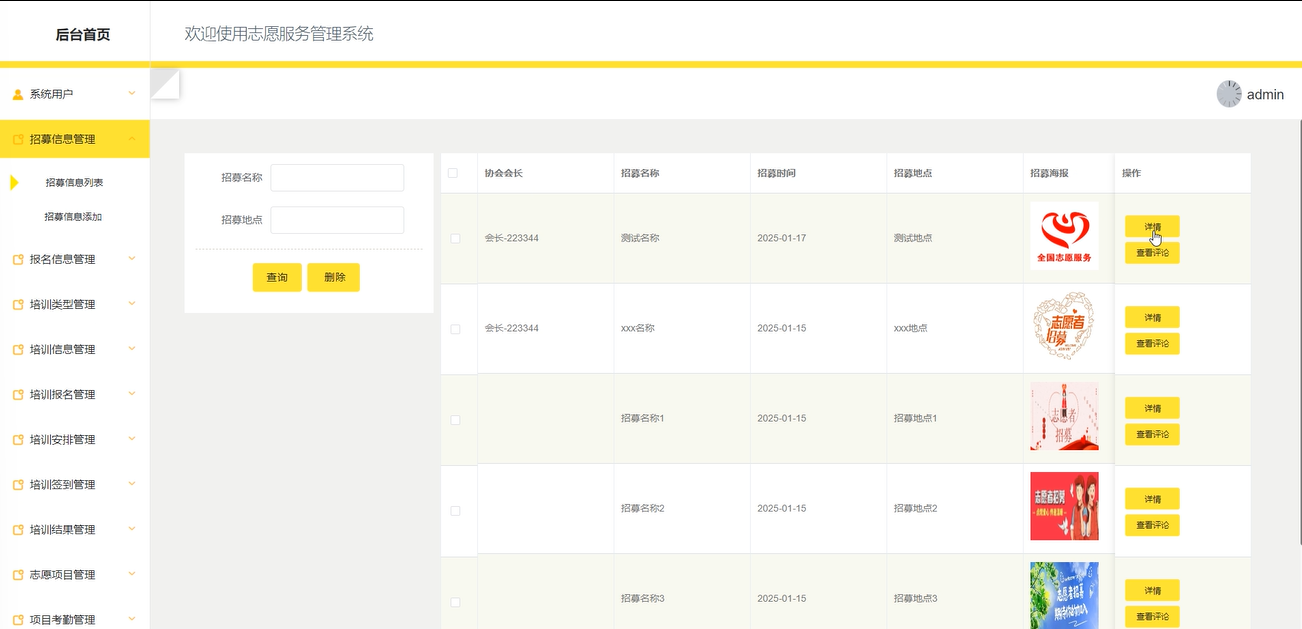 会长用户可以管理招募信息,查看用户评论,通过输入招募名称、地点等条件进行增删改查操作。界面如下图所示。