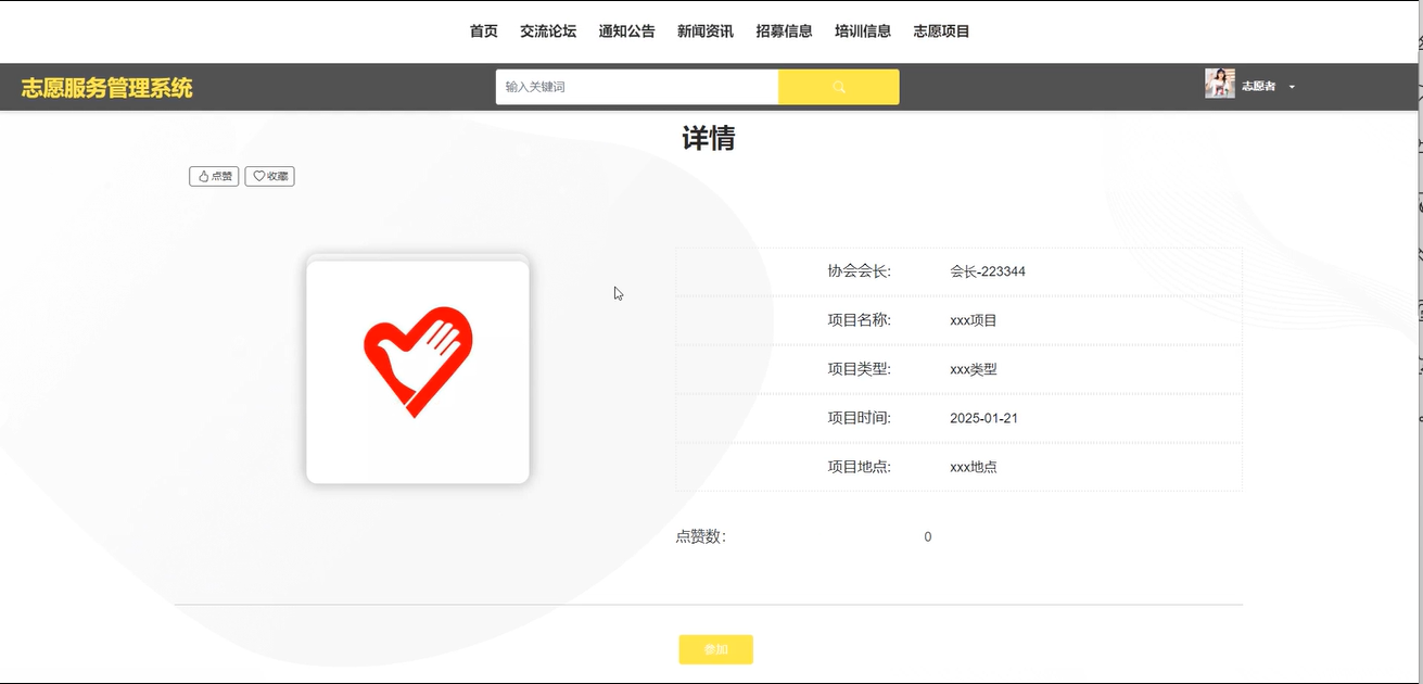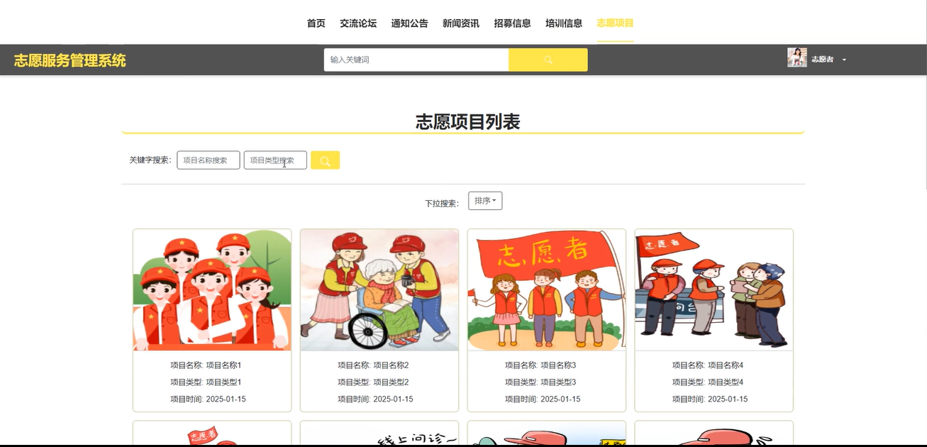志愿者可以查看详细的志愿项目列表,包含项目名称、时间、类型等信息,并通过输入项目名称、类型和下拉排序搜索找到感兴趣的项目。他们还可以对项目进行点赞、收藏和评论,并报名参加。界面如下图所示。