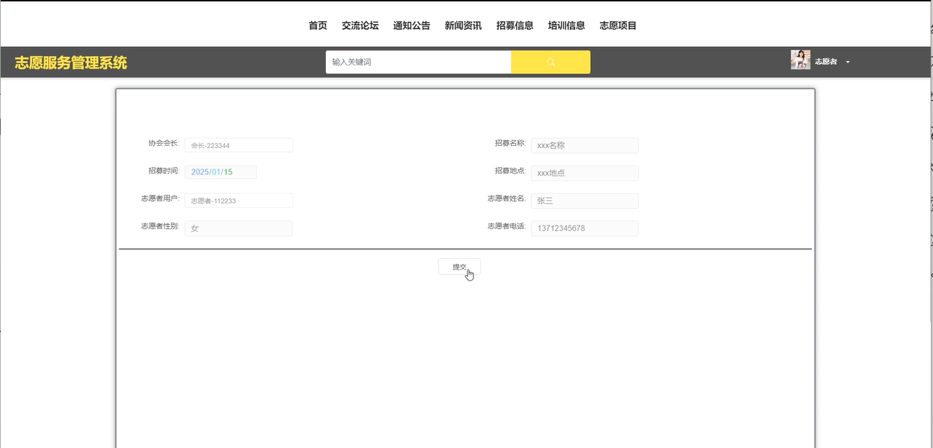 志愿者可以查看报名信息详情,通过输入招募名称、地点、志愿者姓名、性别和审核状态等条件进行搜索查询,并重置搜索结果。此外,还可以查看会长用户的审核回复。界面如下图所示。