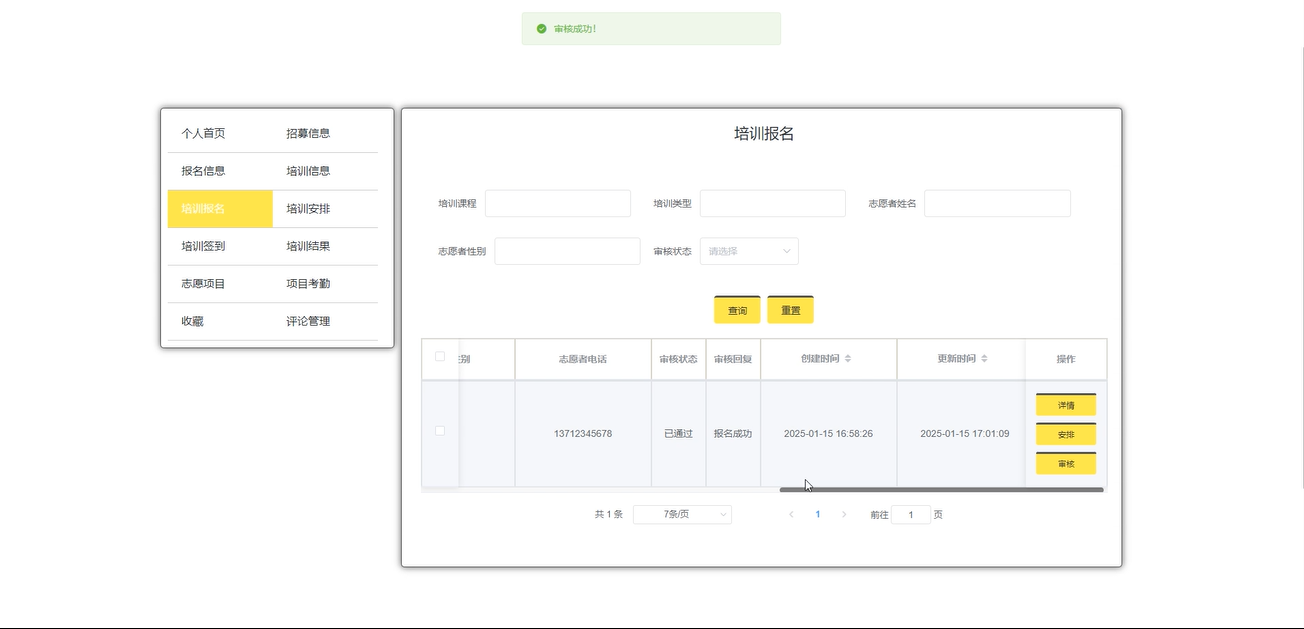 会长用户可以查看用户培训报名信息进行审核并安排,通过输入培训课程、类型、志愿者姓名、性别和选择审核状态等条件进行搜索查询,并重置搜索结果。界面如下图所示。